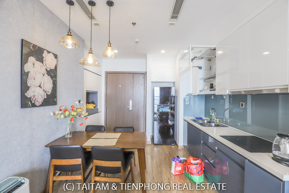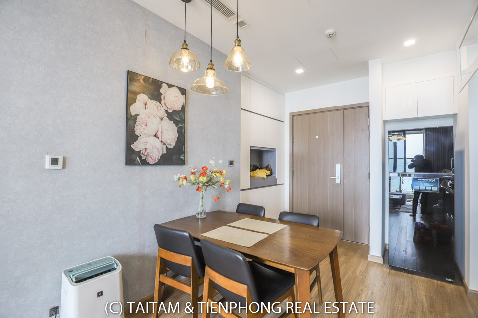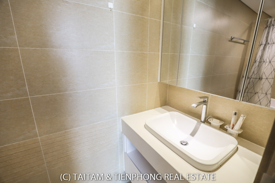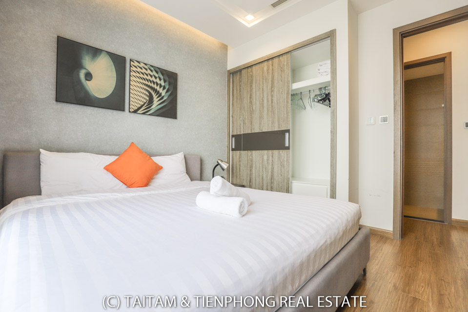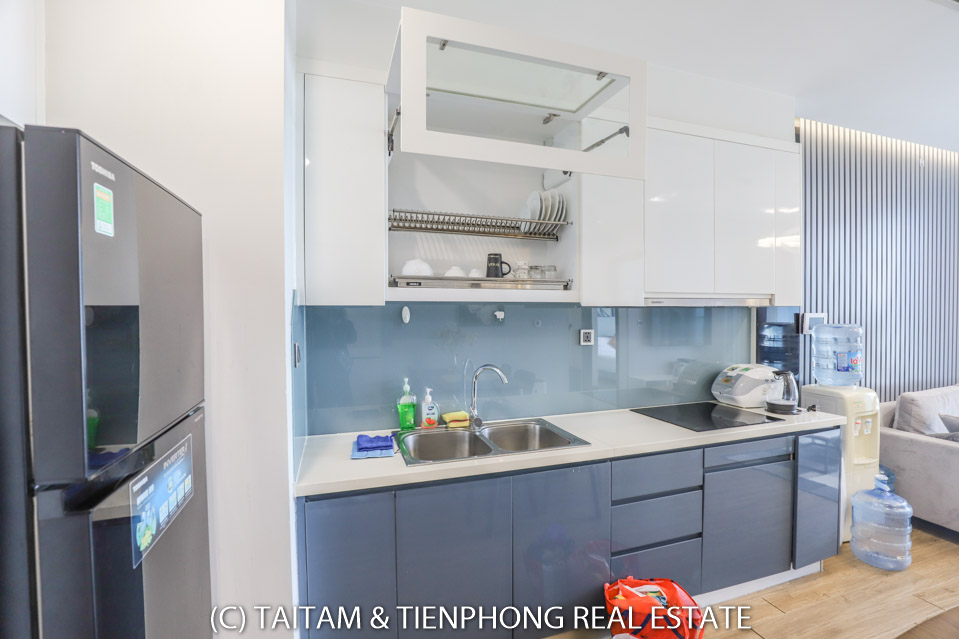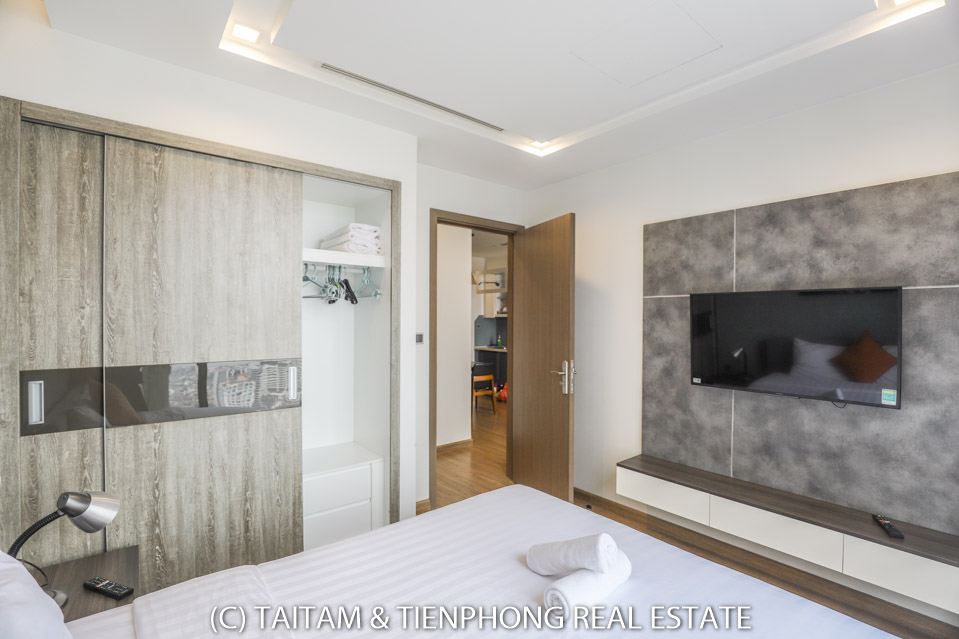 The size apartment is 50 sq m, include and open plan living room combined with dining area, an open kitchen, 01 bedroom, balconies, nice wooden floor, well equipped and decorated. The apartment is at the corner position in the building; thus it is open, airy and light. Fully furnished.