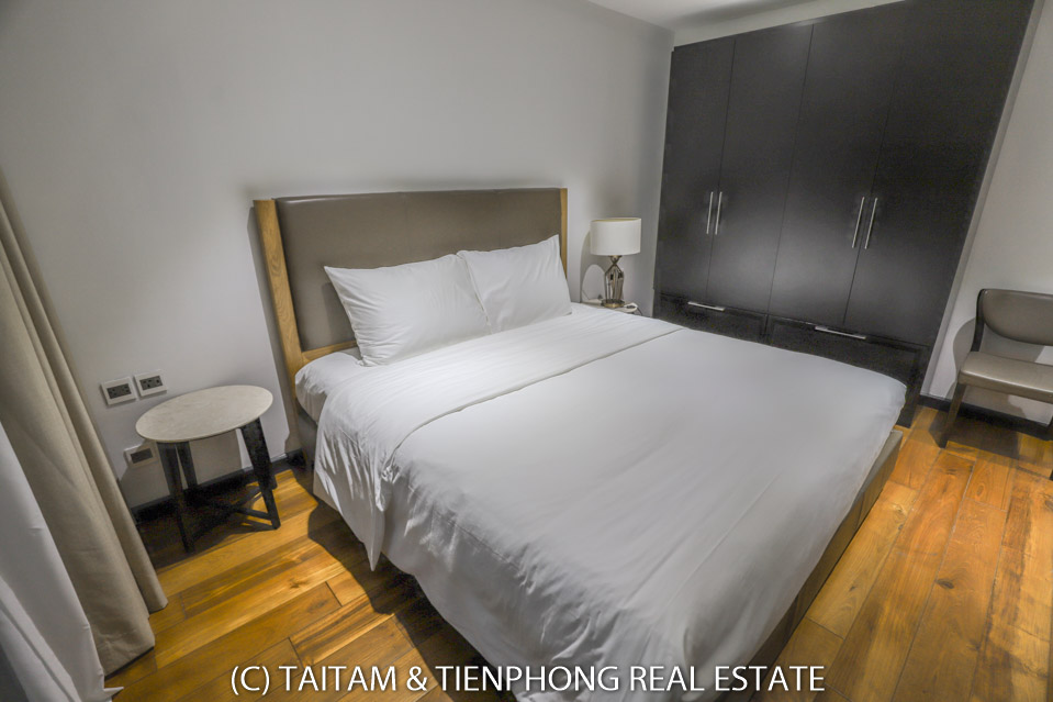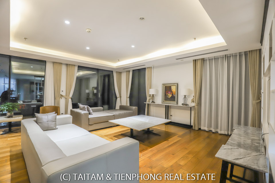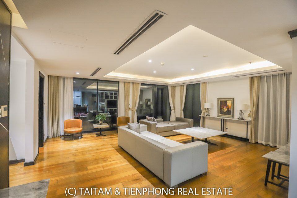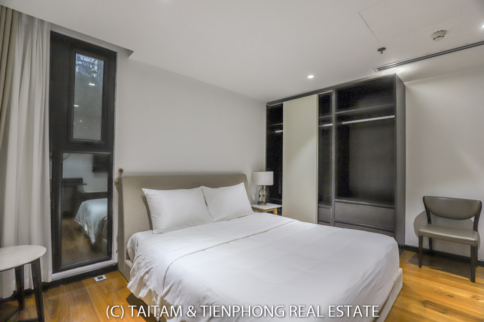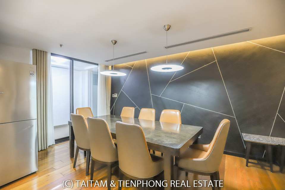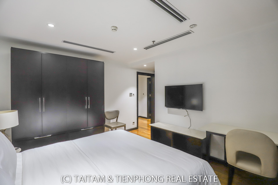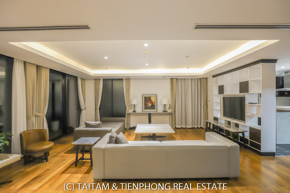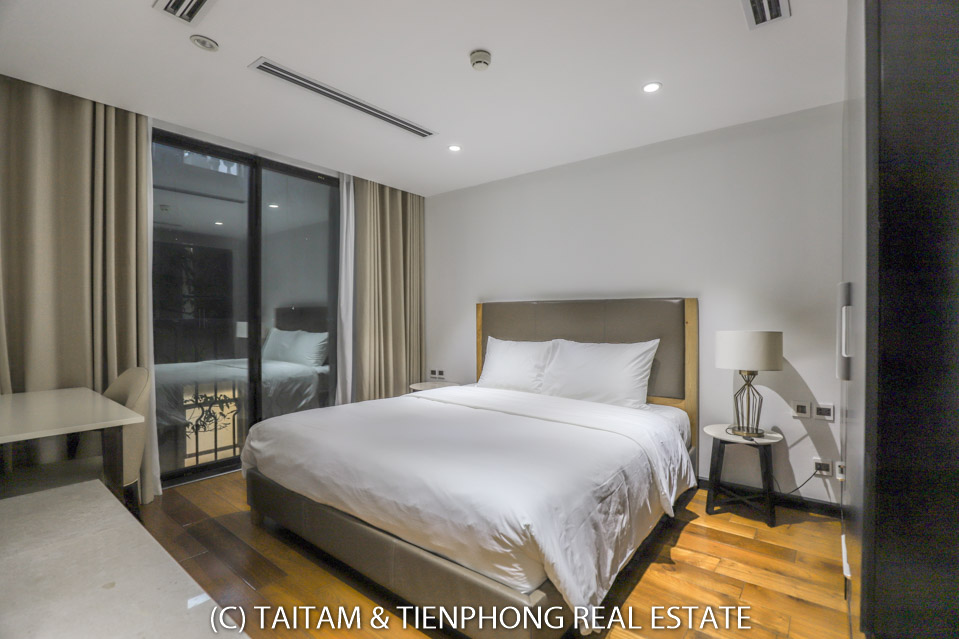 This high quality serviced apartment has a size of 200 sqm. It's living room is particularly spacious and bright thanks to its large windows. The apartment has three bedrooms and three bathrooms. The building is located at the Hoan Kiem districts, you will find easily plenty of shops and restaurants.