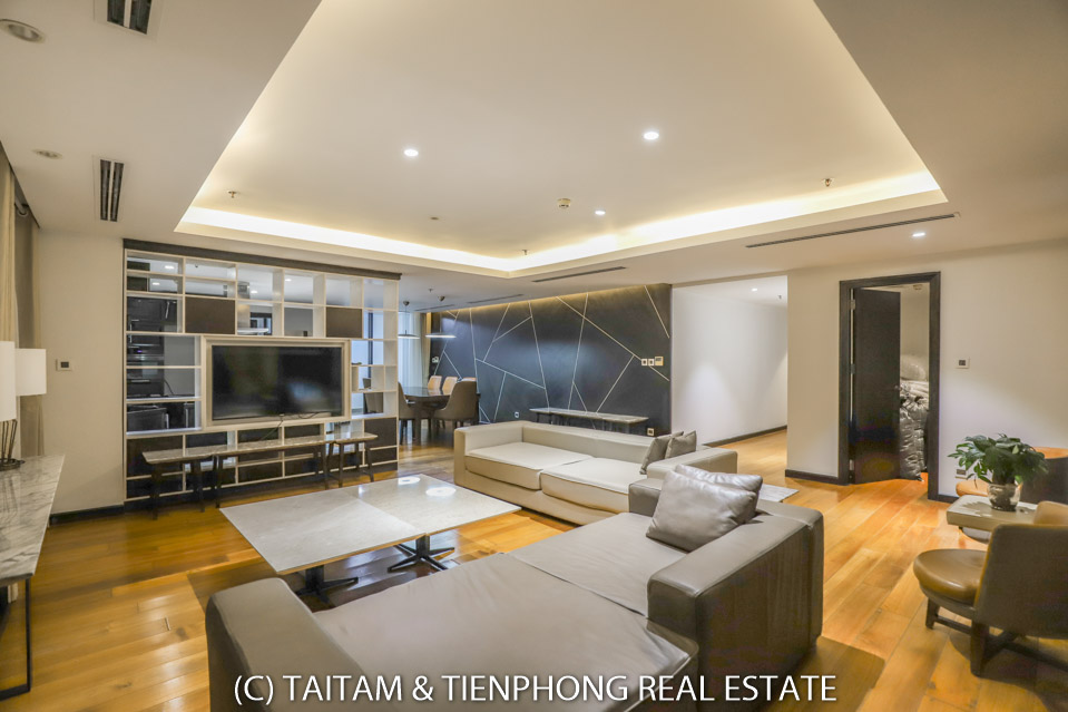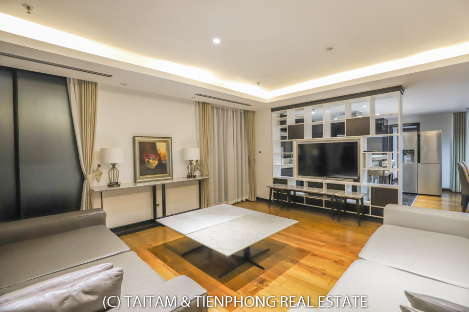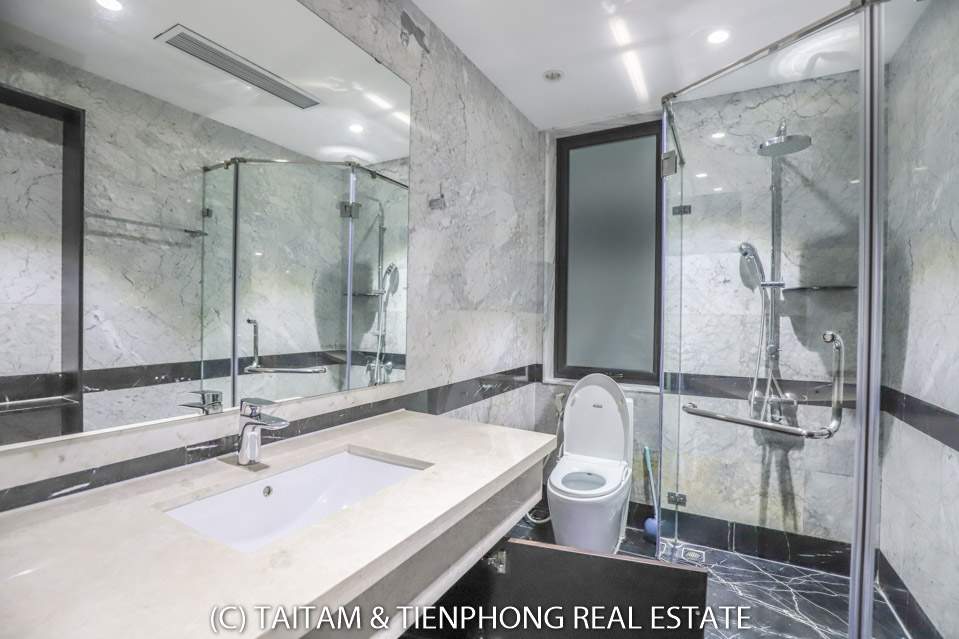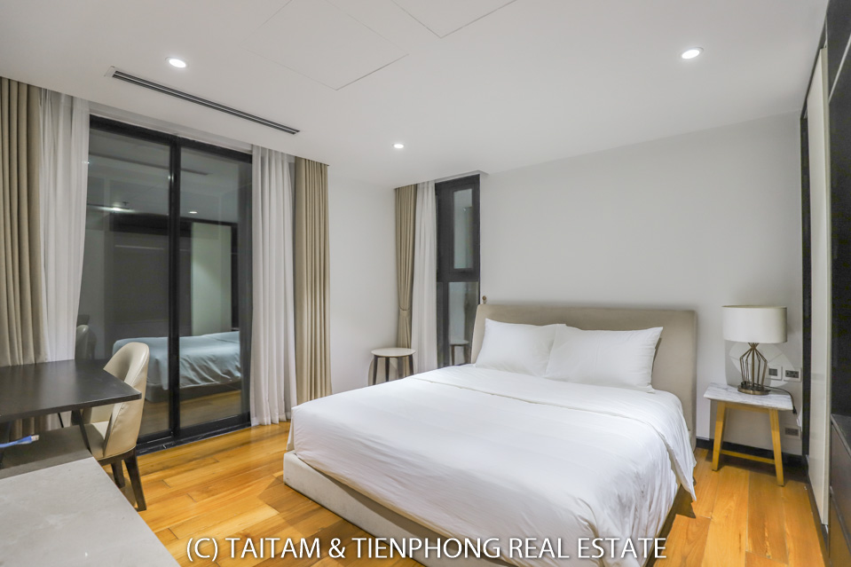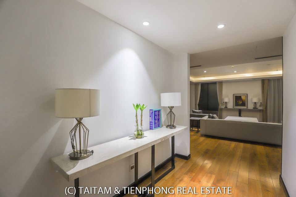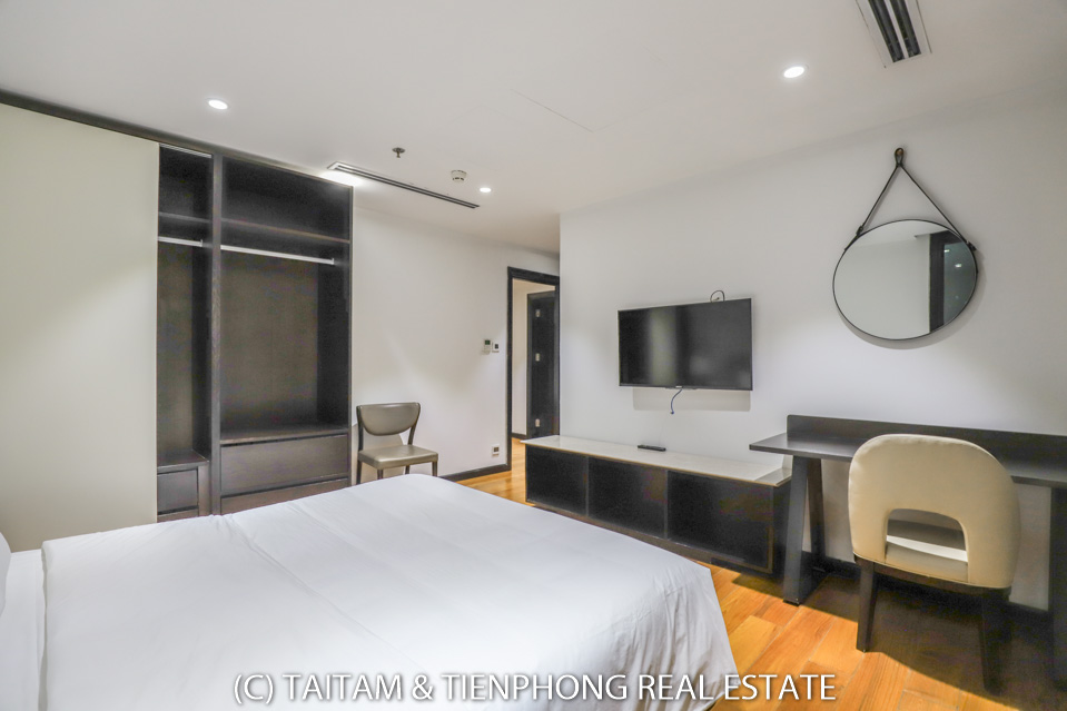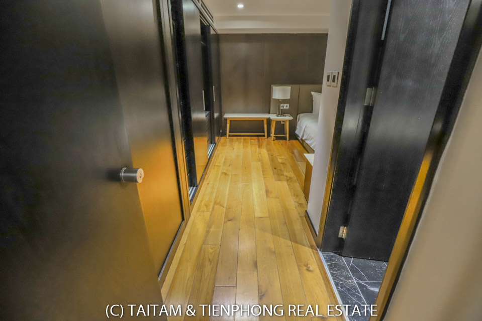 This high quality serviced apartment has a size of 200 sqm. It's living room is particularly spacious and bright thanks to its large windows. The apartment has three bedrooms and three bathrooms. The building is located at the Hoan Kiem districts, you will find easily plenty of shops and restaurants.