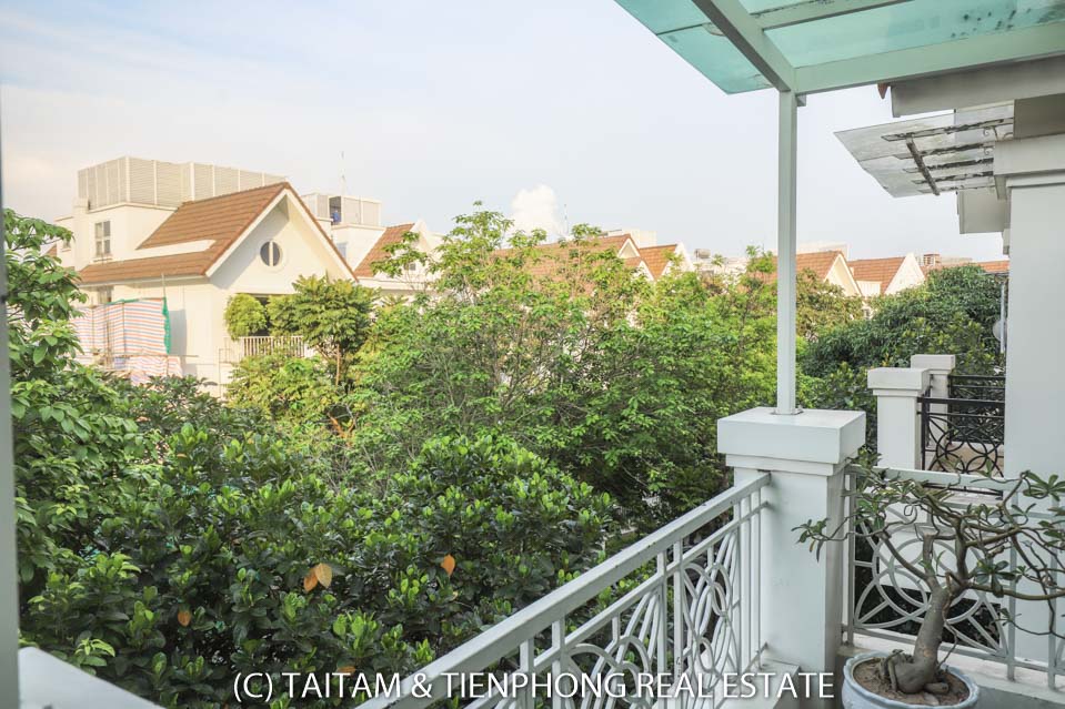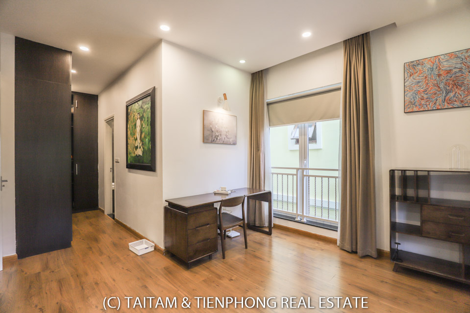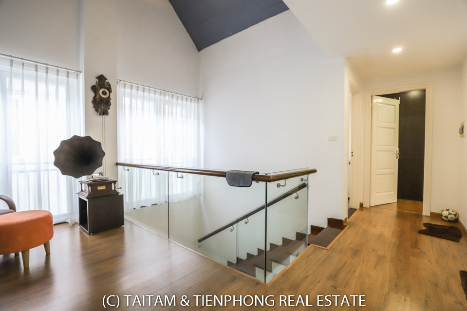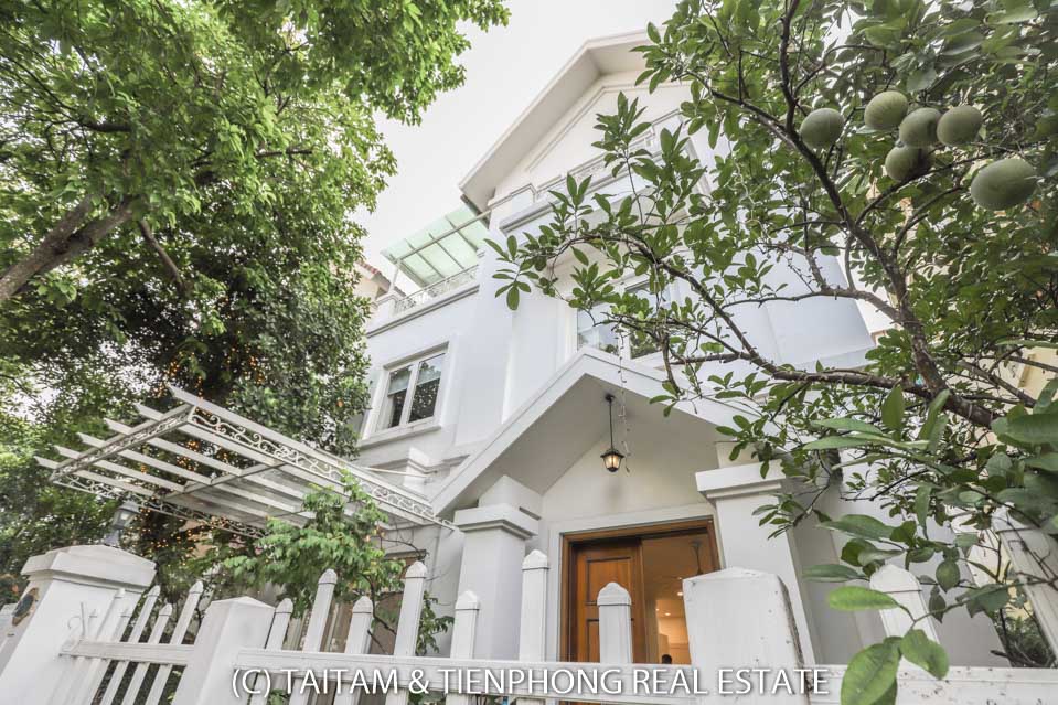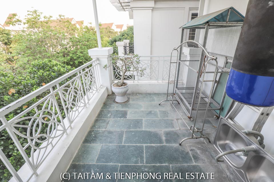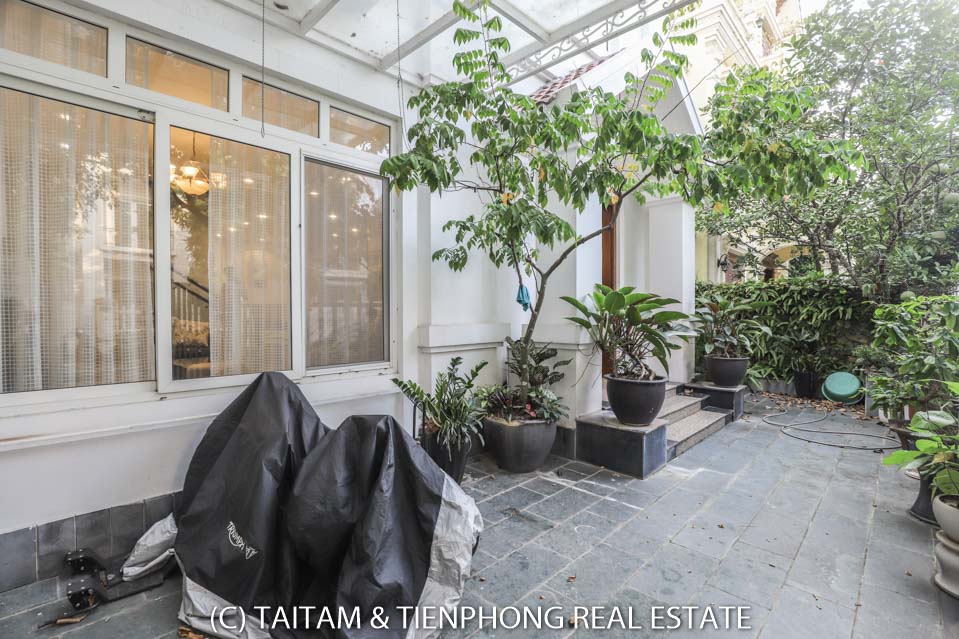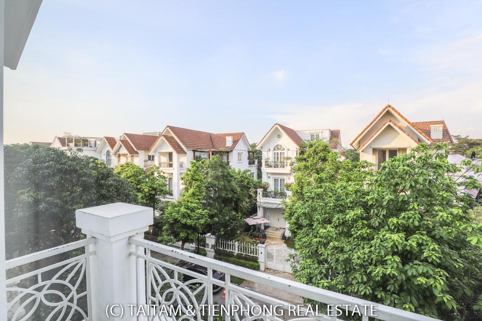 A furnished 4 bedroom villa for rent on Hoa Sua street Vinhomes Riverside. 120 sqm (land area), the house has 03 floors, 04 bedrooms, 04 bathrooms, large living area, well equipped kitchen, spacious balcony and terrace, it also has a good sized courtyard, garden, the surroundings of the house is very open, thus bring a lot of light into all the rooms.