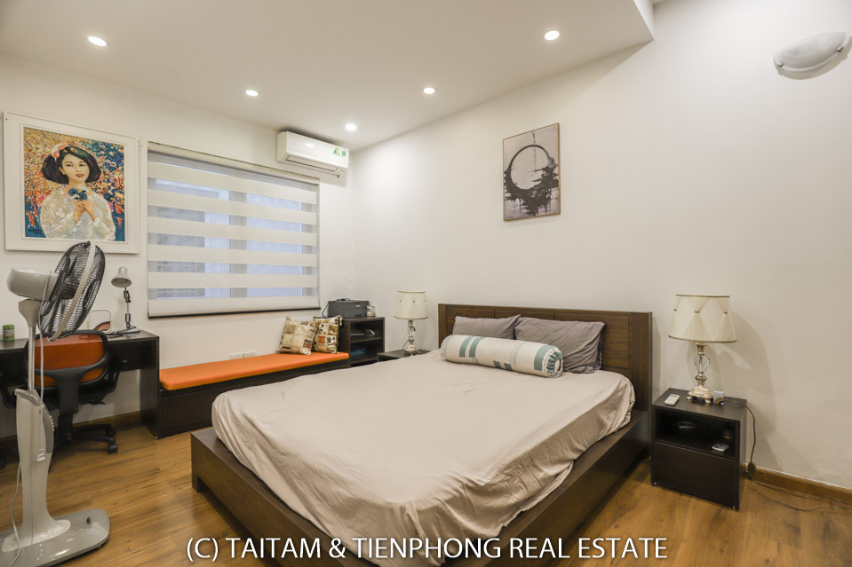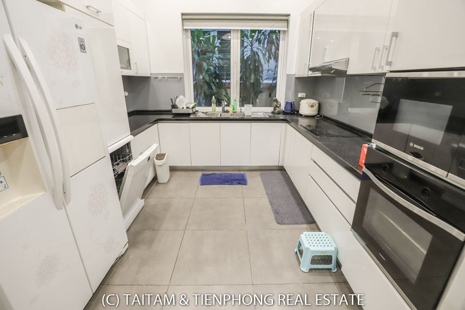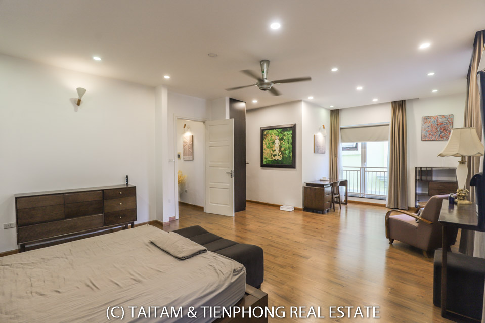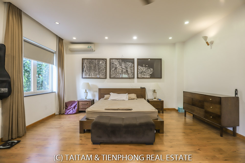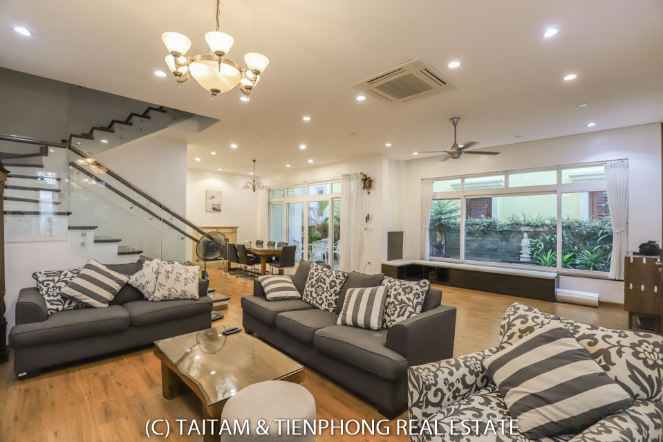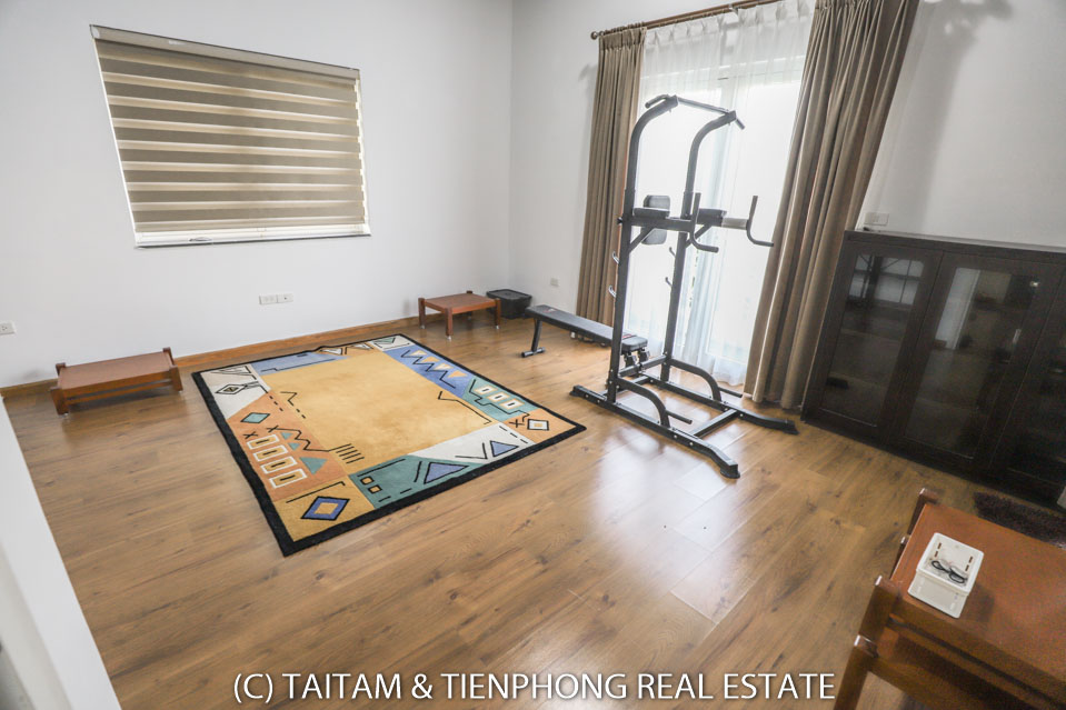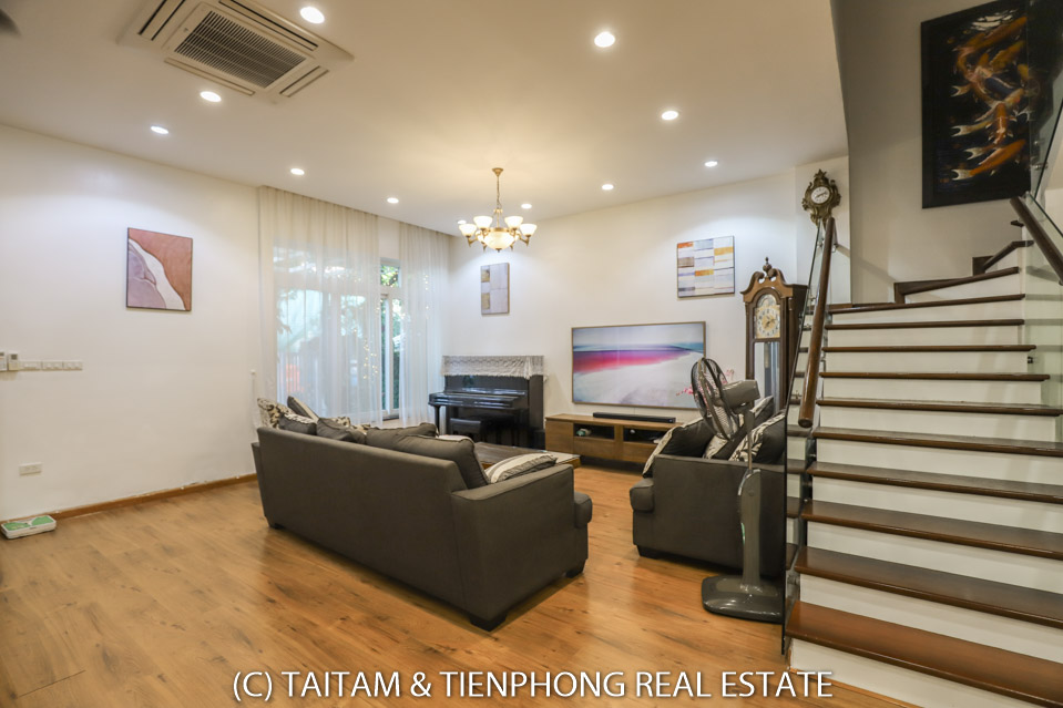 A furnished 4 bedroom villa for rent on Hoa Sua street Vinhomes Riverside. 120 sqm (land area), the house has 03 floors, 04 bedrooms, 04 bathrooms, large living area, well equipped kitchen, spacious balcony and terrace, it also has a good sized courtyard, garden, the surroundings of the house is very open, thus bring a lot of light into all the rooms.